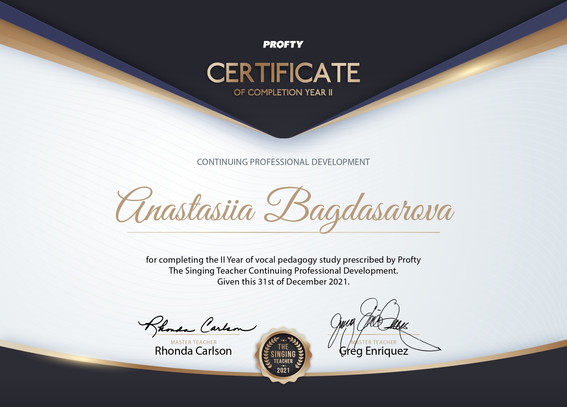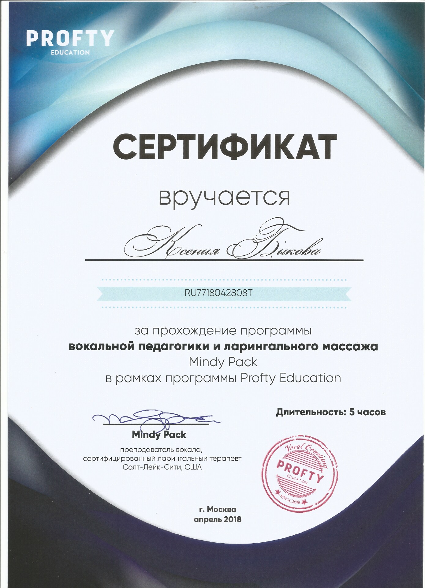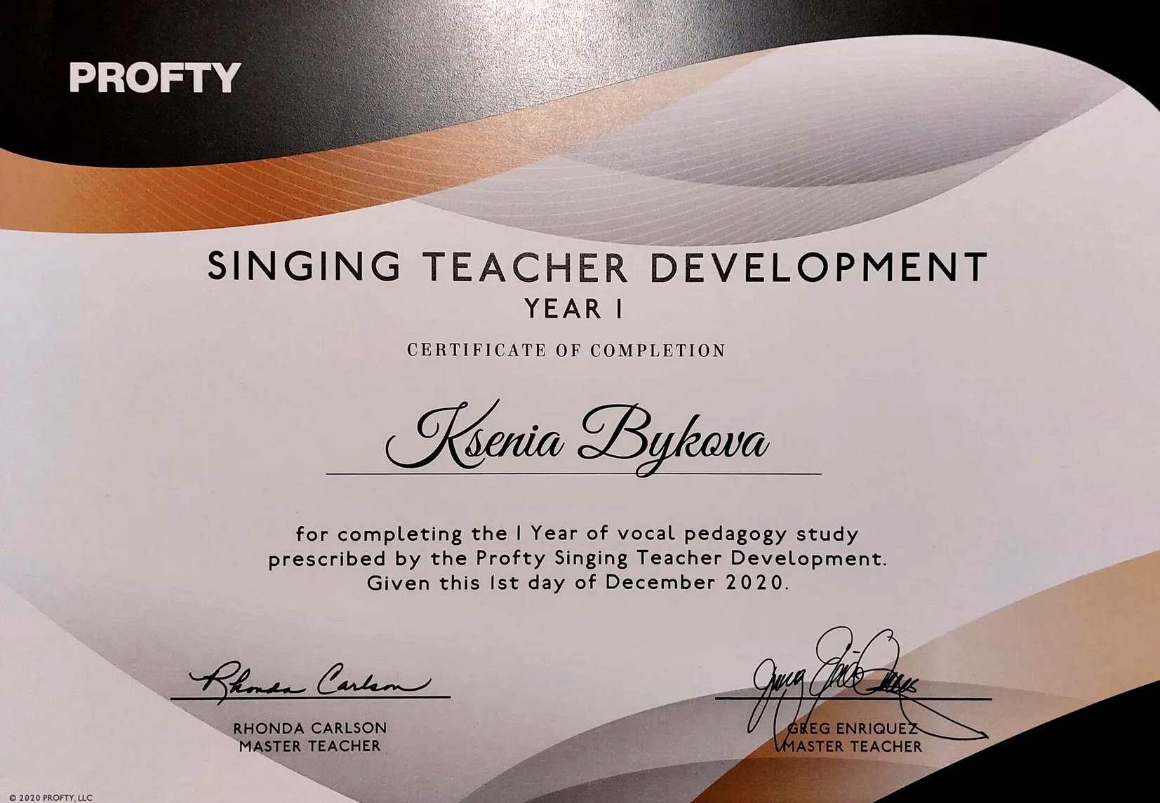 - В 2022-ом - окончила трёхлетний курс (да, он шёл параллельно с муз.менеджментом) «Singing Teacher Development». Это курс повышения квалификации и профессиональной сертификации педагогов по вокалу от лучших преподавателей и преподавательниц из США. Никаких видео-уроков, только постоянное общение с преподами, теория, практика пения и практика преподавания!