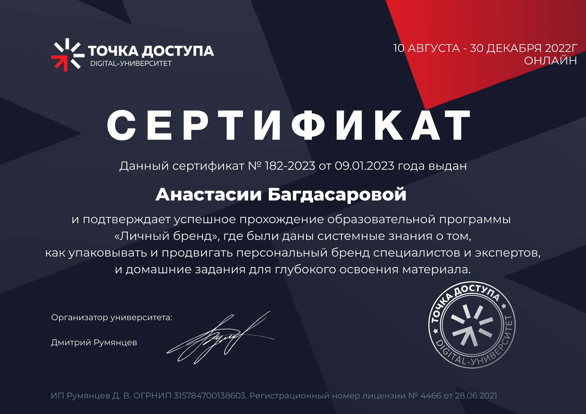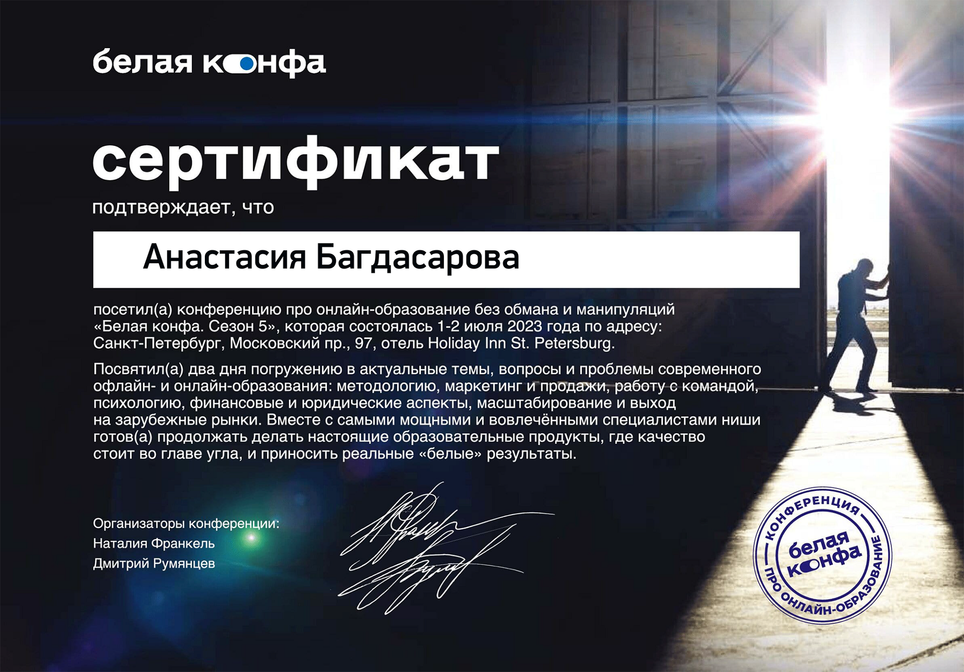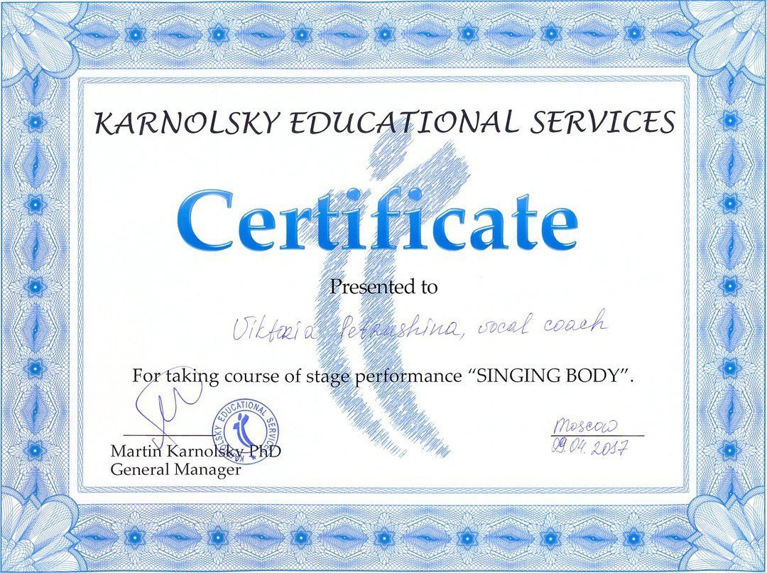 - В 2022-ом - окончила трёхлетний курс (да, он шёл параллельно с муз.менеджментом) «Singing Teacher Development». Это курс повышения квалификации и профессиональной сертификации педагогов по вокалу от лучших преподавателей и преподавательниц из США. Никаких видео-уроков, только постоянное общение с преподами, теория, практика пения и практика преподавания!