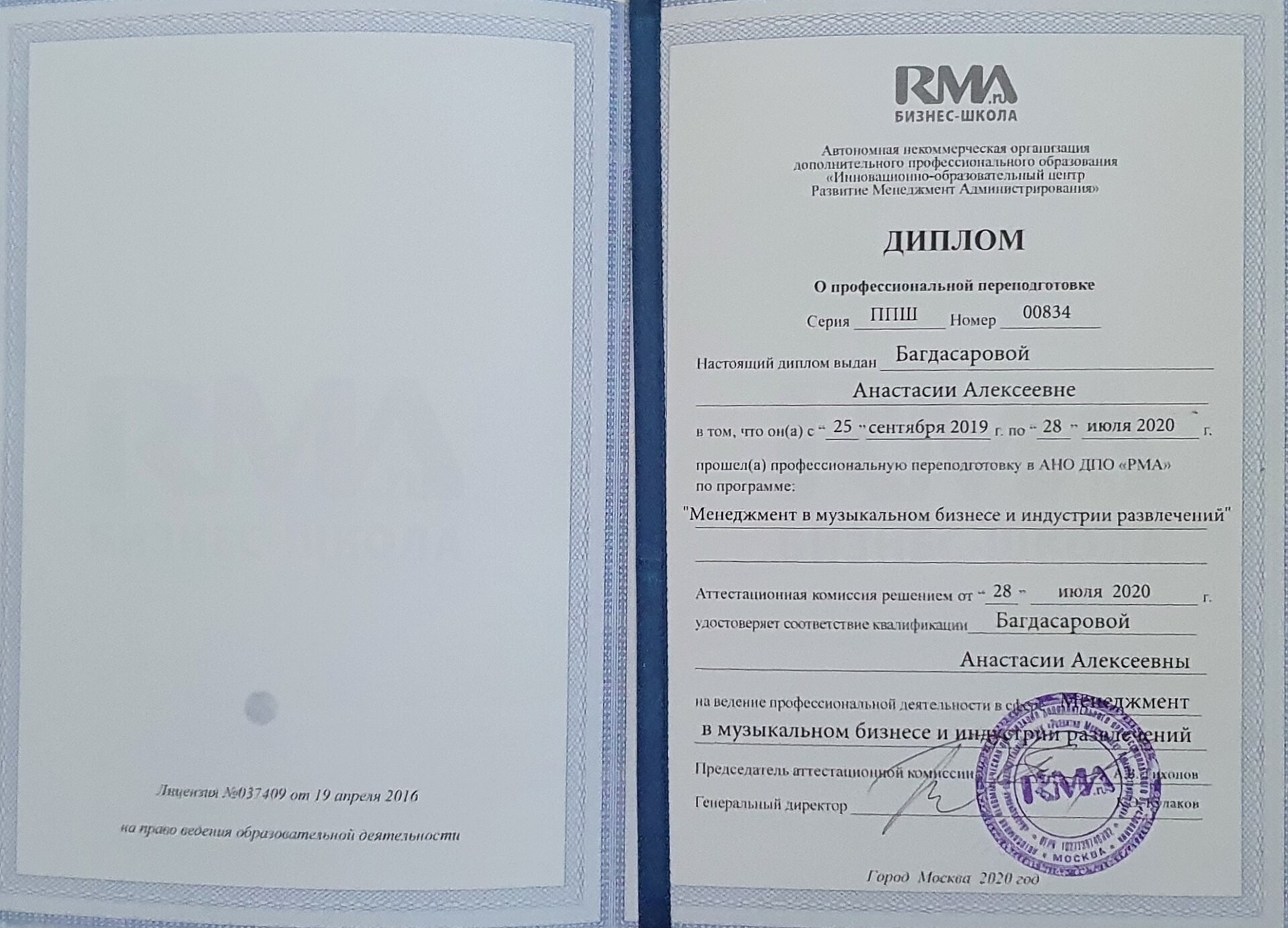 - В 2020-ом - получила ещё одно высшее по музыкальному менеджменту.